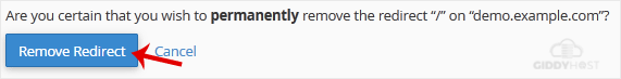 3. Scroll down to the end of the page. Under Current Redirects, locate the domain and click on remove.