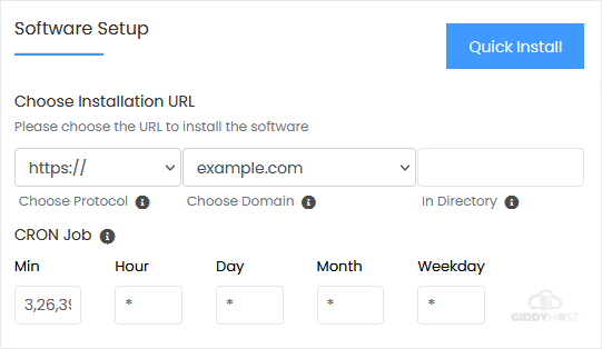 • Choose Installation URL: Choose the appropriate protocol/domain. Inside the "In Directory" field, should you want to install this in a directory, i.e., example.com/directory, enter the directory name. Otherwise, please, leave it blank to install in your main domain, i.e., example.com.